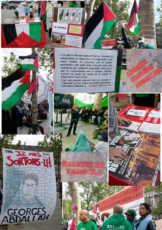 Le CLGIA y était présent : table d’informations, distribution de tracts, tags, pochoirs et prises de parole. Une occasion de rappeler l’engagement de Georges Abdallah pour une Palestine libre. Beaucoup de monde, de questions et de solidarité exprimée pour notre camarade. L’appel internationaliste de ce jour-là à Nuit Debout a favorisé des échanges avec des militants argentins, italiens, marocains, palestiniens. Une interview intéressante avec un journaliste américain nous a permis de souligner l’ingérence des États-Unis dans le dossier de Georges Abdallah, et de rappeler les propos d’Hillary Clinton sur ce sujet…