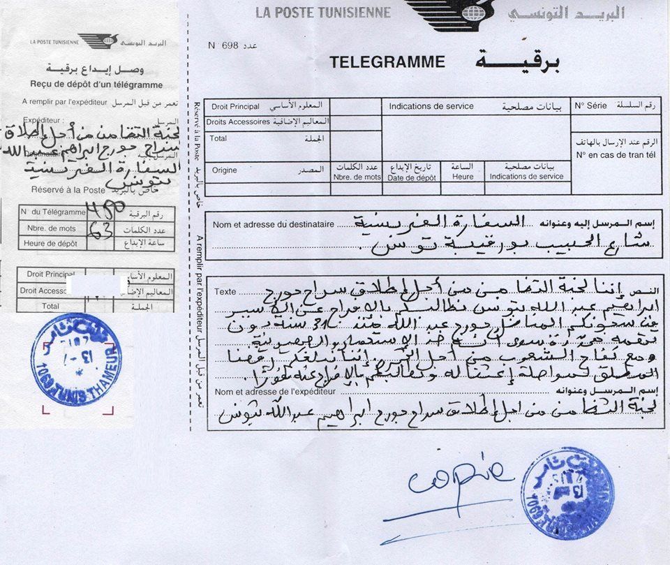 ✭ Le comité tunisien de solidarité avec Georges Ibrahim Abdallah a envoyé le 13 juillet un télégramme au gouvernement français, via son ambassade en Tunisie, exigeant la libération immédiate de Georges Ibrahim Abdallah, détenu depuis 31 ans dans les prisons françaises sans inculpations spécifiques, si ce n'est son engagement antisioniste, anticolonialiste et en faveur des peuples en lutte.