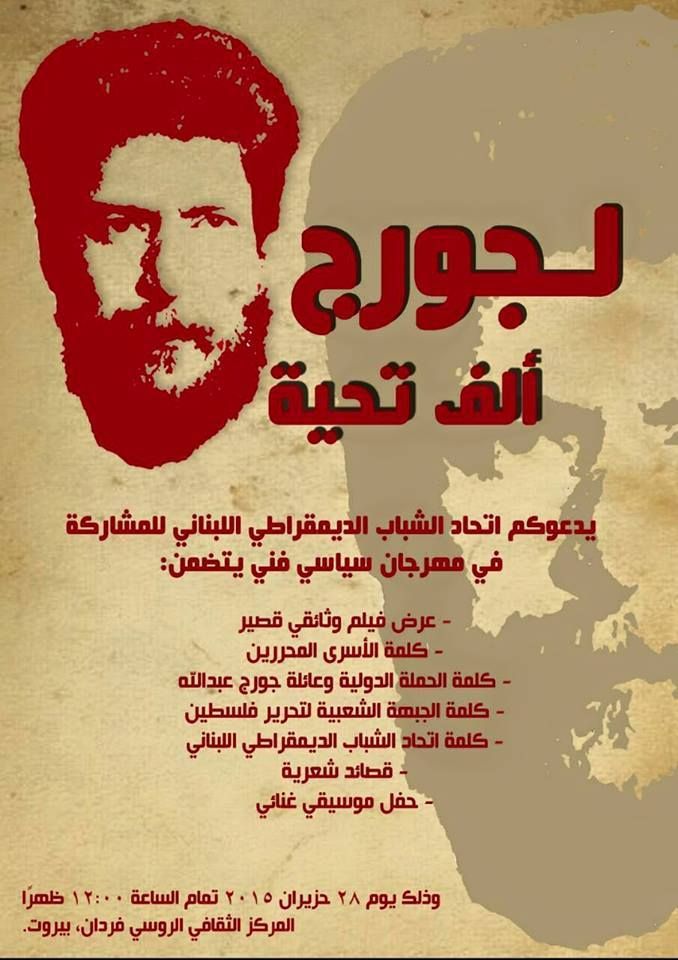 ✭ Dimanche 28 juin 2015, au centre culturel russe de Beyrouth, se tenait une journée politique et festive organisée par l'Union des Jeunes Démocrates Libanais (UJDL) en hommage à Georges Ibrahim Abdallah.